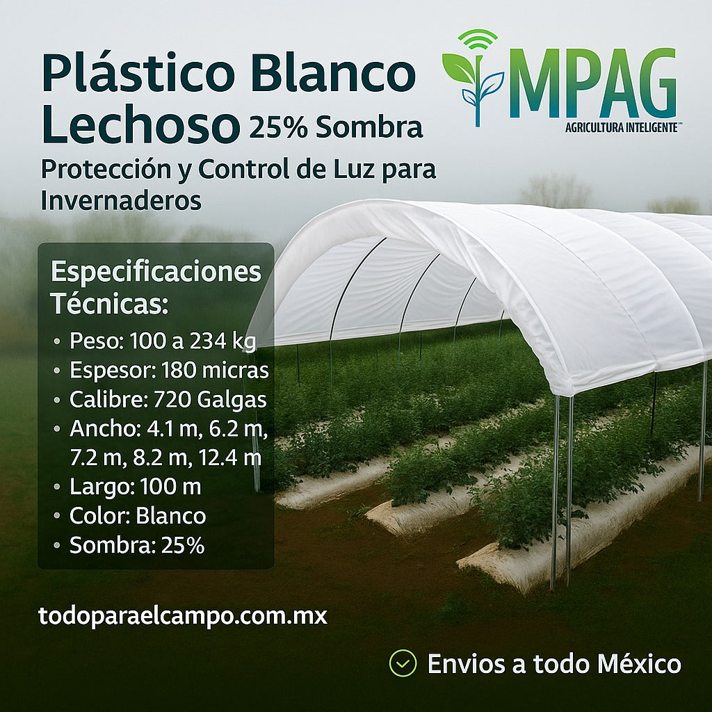 Optimiza el crecimiento de tus cultivos con el Plástico Blanco Lechoso de 25% de Sombra, diseñado para controlar la luz, regular la temperatura y mejorar el desarrollo de las plantas en invernaderos y estructuras agrícolas. Su composición de alta resistencia y tratamiento especial permite un mayor calentamiento interior, favoreciendo un crecimiento más uniforme y protegiendo los cultivos de cambios bruscos de temperatura.